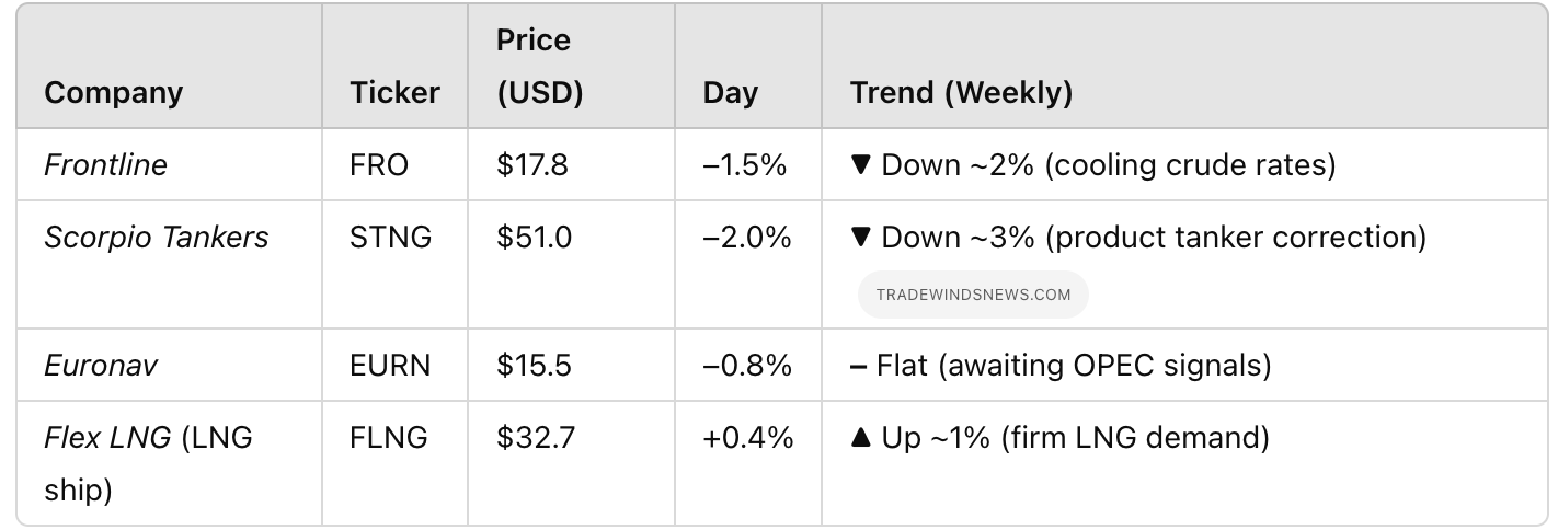 Insight: Tanker equities retreated with broader markets. Product tanker owners fell after a recent rally (e.g. Scorpio –2% today) (Rally aborted: Most shipping stocks back in red after broader market ...). However, LNG carrier stocks are stable to positive, tracking rising gas demand into 2025. Overall, investors remain bullish on tankers’ tight supply, but near-term volatility is driven by oil price swings and geopolitics.