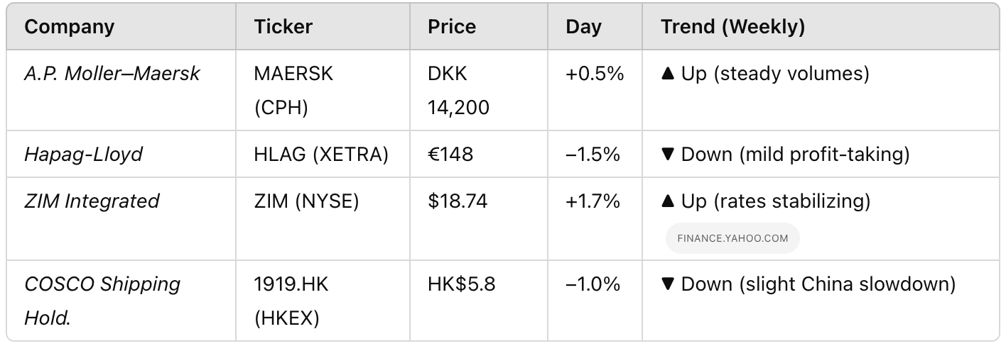Insight: Container shipping stocks are mixed. ZIM rose +1.7% today, bouncing on improved rate outlook (ZIM Integrated Shipping Services Ltd. (ZIM) Stock Historical Prices ...). Maersk and Hapag-Lloyd trade near flat this week – volumes are strong but freight rates have normalized from last year’s highs. Investors are watching alliance reshuffles and cost-cutting for future earnings direction.
